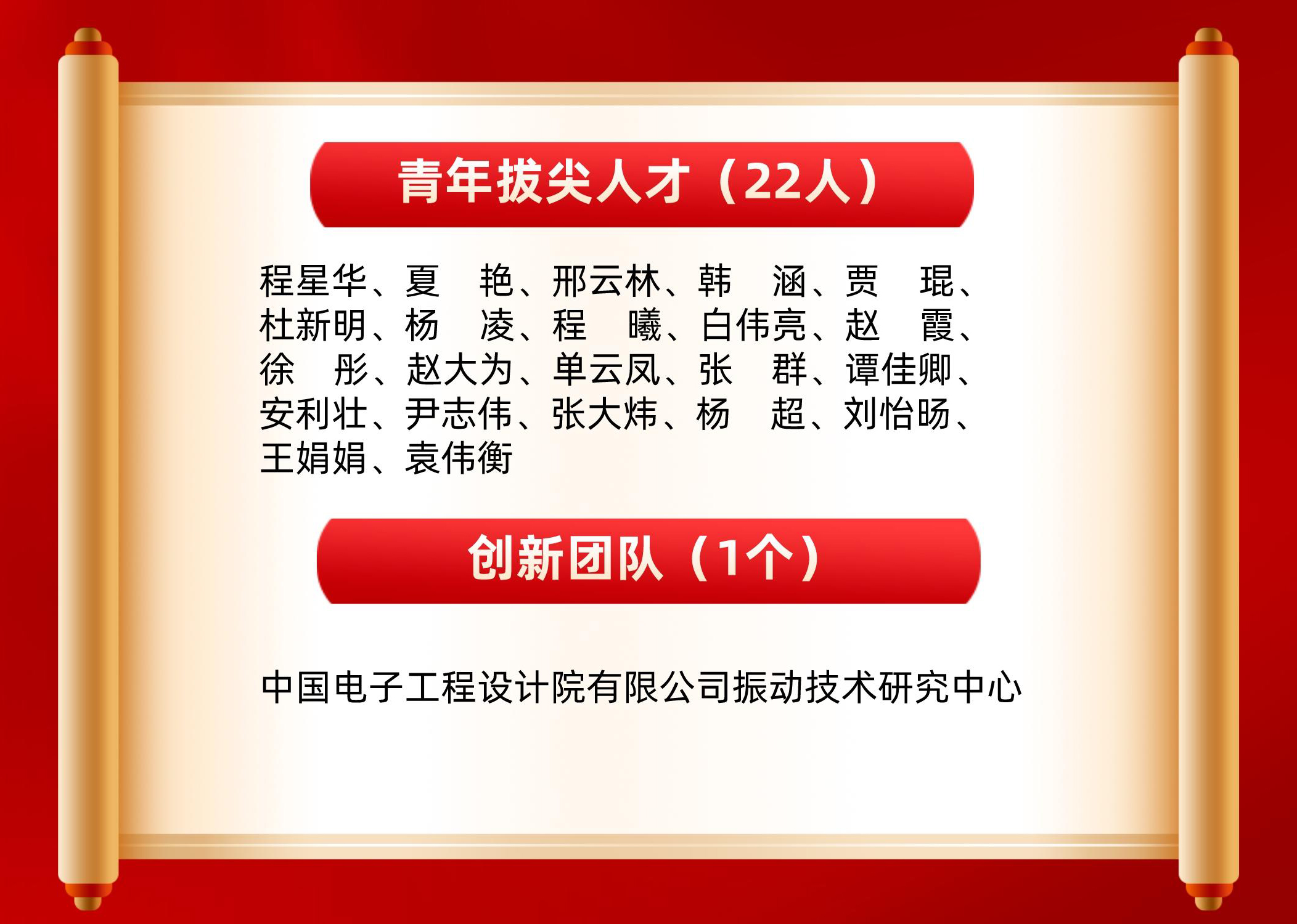 经过遴选,中国电子院报送的科技创新人才及团队以大比例成功入选。娄宇等43位同志成功入选国投集团首批158人科技带头人名单,其中首席科学家入选1人,首席专家入选7人,特级专家入选13人,青年拔尖人才入选22人。“中国电子工程设计院有限公司振动技术研究中心”成功入选国投集团首批创新团队名单。