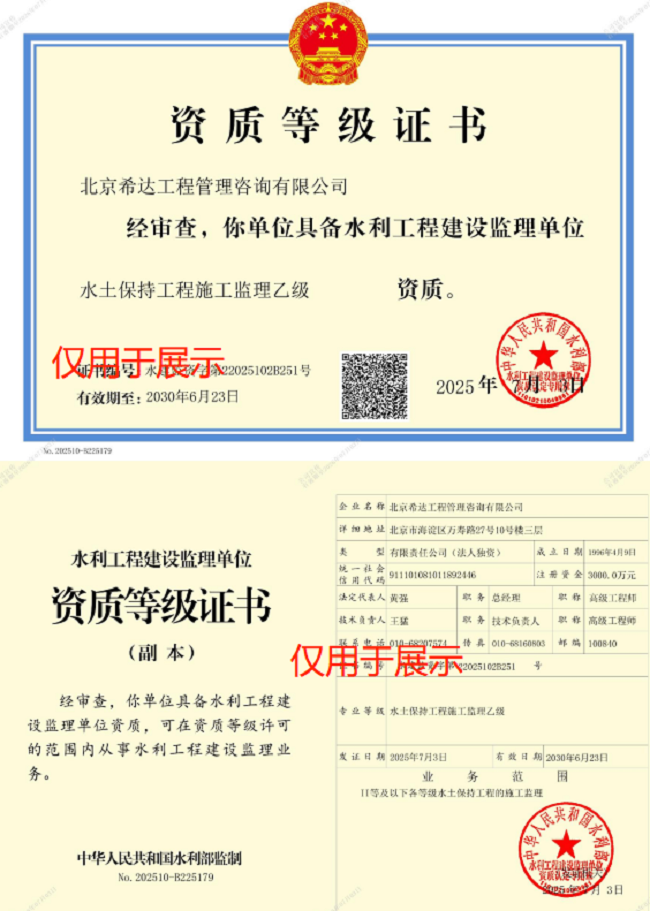 2025年7月3日,经中华人民共和国水利部核准,中国电子院希达咨询公司喜获水利工程施工监理乙级、水土保持工程施工监理乙级两项资质,这是希达咨询公司在资质建设工作上取得的一次重大突破。