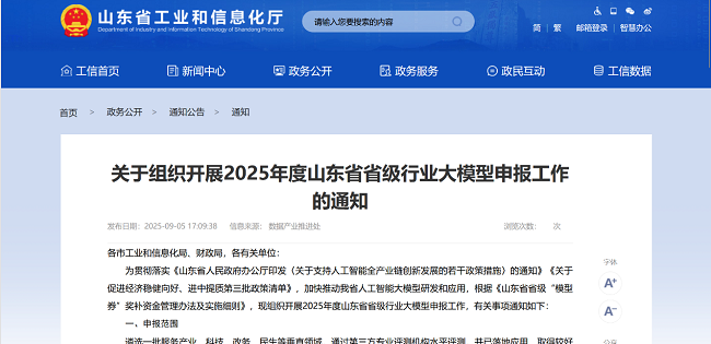 2025年9月5日,山东省工业和信息化厅下发了《关于组织开展2025年度山东省省级行业大模型申报工作的通知》,明确指出,拟申报的大模型应“通过第三方专业评测机构水平评测”,作为申报的必要条件。